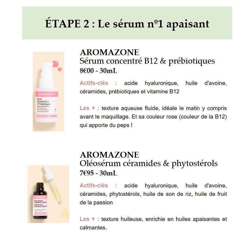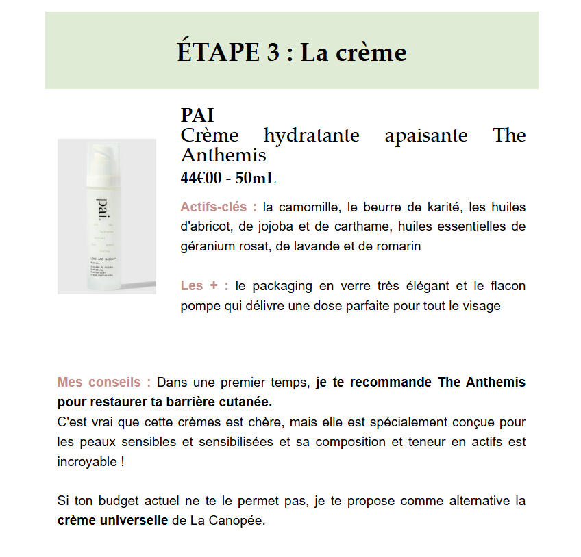 Si tu choisis la formule La Minimaliste ou L'Essentielle, je te proposerai 1 crème, 1 sérum, 1 shampoing... C'est 1 recommandation par type de produits.Si tu choisis la formule La Généreuse ou L'Abondante, je te proposerai 3 crèmes, 3 sérums, 3 shampoings...... C'est 3 recommandations par type de produits. Comme ça, tu pourras choisir librement entre ces 3 produits en fonction de tes préférences ou des produits que tu trouves. Toutefois, je te mettrai toujours des conseils et explications sur les différences entre les 3 recommandations et mon opinion en fonction de ta situation.